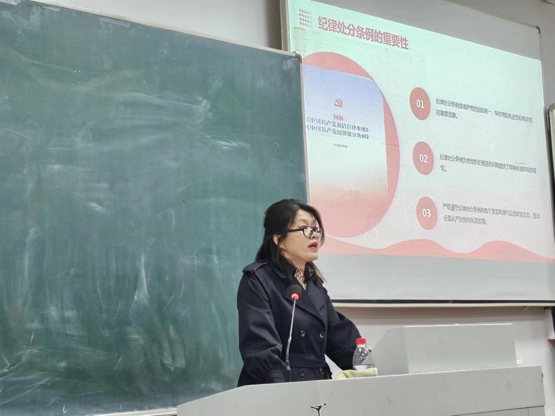 徐静波首先向大家讲述了《中国共产党纪律处分条例》修订的历史沿革、每次修改的主要内容,之后她向大家介绍了党的纪律处分的分类,并重点围绕新版《中国共产党纪律处分条例》中政治纪律、组织纪律、廉洁纪律、群众纪律、工作纪律、生活纪律六个方面结合典型案例对各类违纪行为和处分逐一阐述,带领大家对照学习新版《中国共产党纪律处分条例》中新增加的内容。