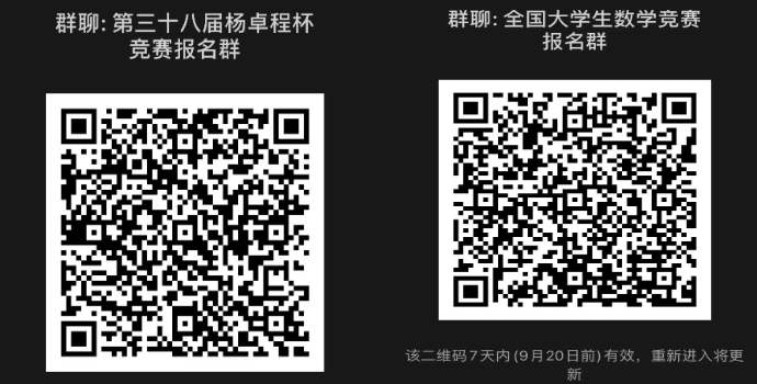 线下报名地点为数学院办公楼 A8-133(参赛同学请务必加入下面微信群,有关事宜将在群里通知)。报名时间:2024年9月18日-24日晚上:18:00-20:00。