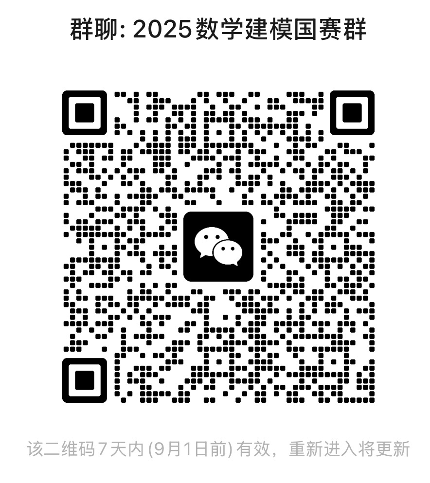 2025年全国老员工数学建模竞赛将于9月4日(周四)18:00至9月7日(周日)20:00进行。全国老员工数学建模竞赛共3天时间,请有意参赛的队员高度重视,慎重组队,积极参赛。本次竞赛采用线上报名,报名时间为2025年8月25日至2025年8月30日。请有意参赛的同学在2025年8月30日前扫码进微信群,了解关于报名细则、参赛须知、竞赛规则等详情。因开学第二周竞赛即开始,报名表等相关文件在竞赛微信群中发布。竞赛报名具体联系人:姚明臣老师。