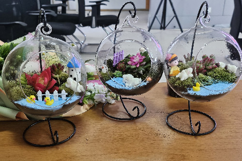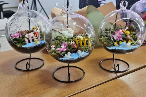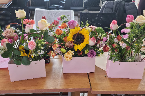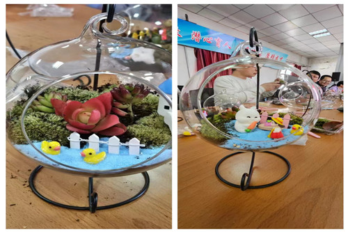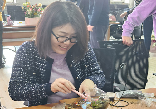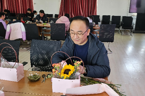 活动分为“创意微景观制作”和“插花”两个部分,各位老师了解了花的品种、花语、色彩搭配及花艺制作步骤后,按照自己的喜好和搭配,互相交流、相互配合,呈现了一个个美丽缤纷的作品。男教职工也满怀期待和爱意为自己的亲人制作花束惊喜,现场一片欢声笑语,老师们感受着亲手创作的乐趣和插花艺术带来的美好体验,沉浸在创作和欣赏的喜悦之中。
