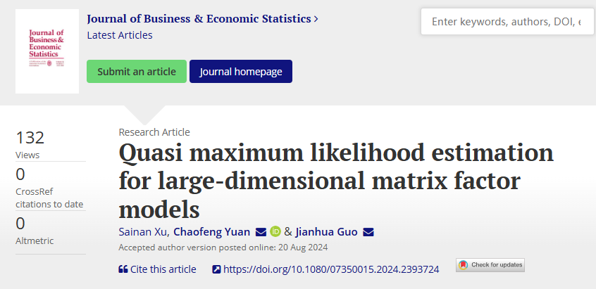 近日,公司袁超凤教授与其合作者的学术论文“Quasi maximum likelihood estimation for large dimensional matrix factor models”在统计学与计量经济学国际权威期刊Journal of Business & Economic Statistics在线发表。该论文第一单位为304永利集团,合作者有徐赛男(304永利集团已毕业研究生, 现为东北师大在读博士生)和北京工商大学的郭建华教授。
