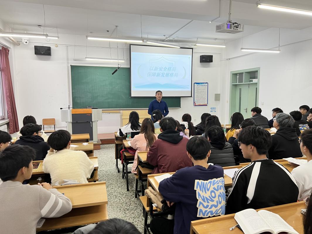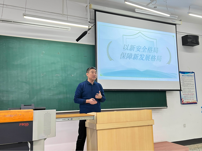 张龙以“保证国家安全是头等大事”展开讲解,从鸦片战争以后、新中国成立后、改革开放以来三个方面阐释了维护国家安全,事关国运兴衰,鼓舞同学们坚定文化自信、秉持开放包容、坚持守正创新、扛起时代责任,在新的起点上继续推动建设现代文明国家。他强调只有科技自立自强,国家才能安定,并提出学习数学等基础学科,要善于坐冷板凳、并努力把冷板凳坐热,希望同学们能够立志为解决“卡脖子”技术难题而不懈努力学习。张龙向同学们进一步阐释了国家安全是民族复兴的根基,稳中求进的“稳”指保安全,“进”指促发展,并结合自身密码学与网络空间安全的学科专业背景,引导同学们深刻认识世界百年未有之大变局的加速演进,深入理解推动构建人类命运共同体的丰富内涵和时代价值,倡导要知时势、明趋势,放眼世界、展望未来,勇于担当、砥砺奋斗,在世界之变,时代之变中答好青春答卷。
