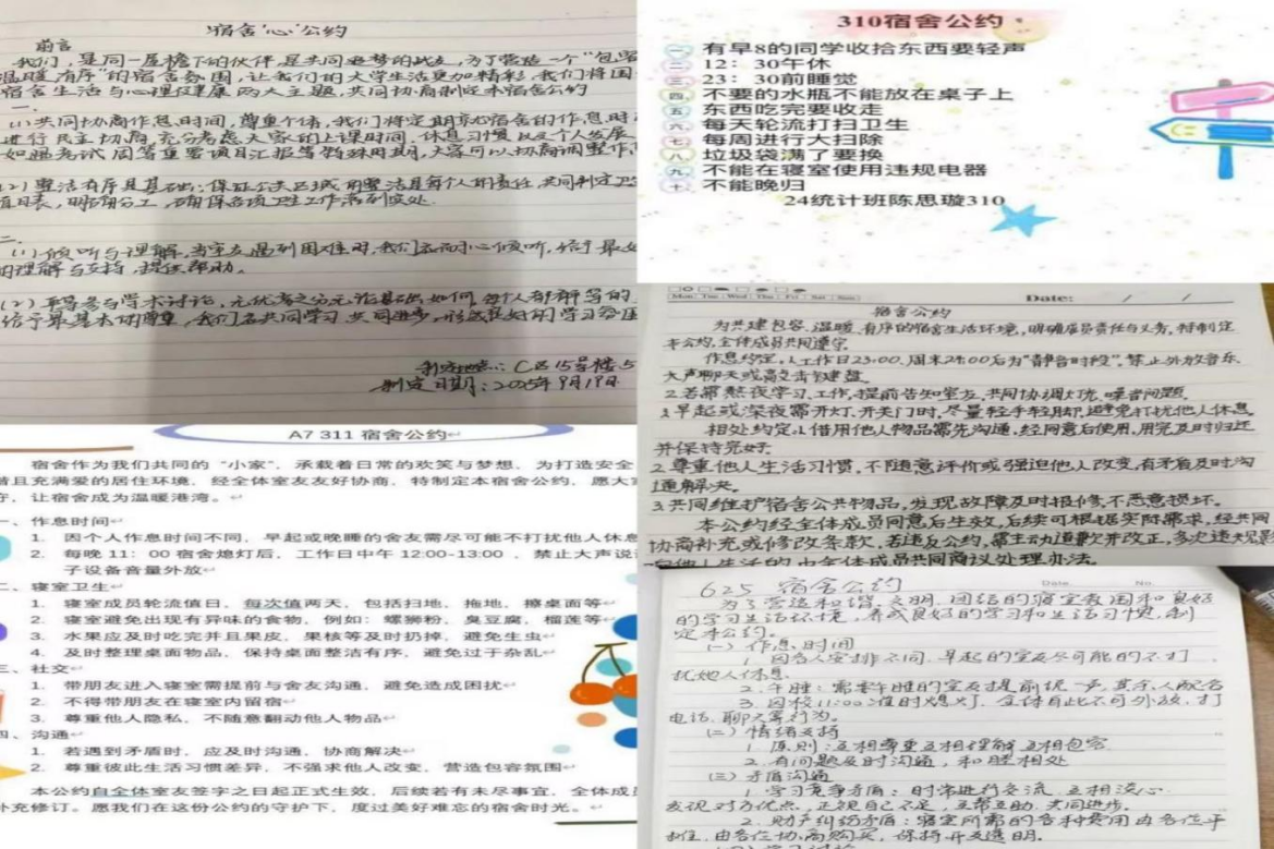 为营造积极健康、和谐友爱的宿舍氛围,“润心沐阳”二级心理辅导站于9月16日至9月19日组织开展“宿舍‘心’公约”共创活动。同学们踊跃响应、积极投入,围绕作息规划、卫生管理、沟通技巧、学业互助等多个维度,共同制定出极具宿舍特色的“心”约定,充分彰显了同学们对共建优质宿舍生活的共同期许与主动作为。我们相信,在这些充满温度的共同约定指引下,每一间宿舍都将成为大家大学时光中的温馨港湾。