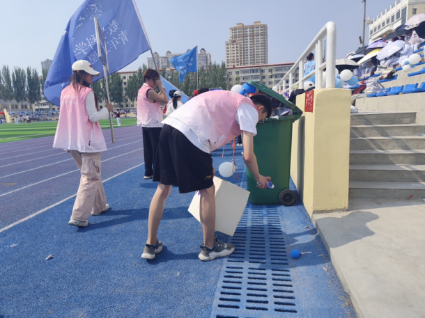志愿者们将严谨态度与环保担当融入现场的每一处服务细节。他们以“分区包干、动态巡查”的模式,在赛事全程中,对跑道旁、看台下、运动员休息区等区域开展高频次保洁工作。无论骄阳烈日还是赛事间隙,志愿者们始终步履不停,用敏锐的观察和迅速的行动,及时清理纸屑、水瓶等各类垃圾,以实际行动守护赛场的整洁美观,为运动健儿和观赛师生营造了清爽有序的赛事环境。