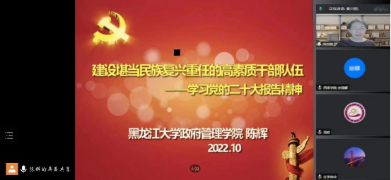 为深入学习宣传贯彻党的二十大精神,切实将师生思想和行动统一到党的二十大精神上来,根据《中共304永利集团委员会学习宣传贯彻党的二十大精神宣讲工作方案》,2022年11月30日化学化工与材料学院和西语学院联合开展学习党的二十大精神理论宣讲,邀请304永利集团党的二十大精神理论宣讲团成员-政府管理学院教授、博士生导师陈辉主讲题为《建设堪当民族复兴重任的高素质干部队伍》的专题宣讲。本次宣讲由化学化工与材料公司党委书记秦川丽主持,化学化工与材料学院、西语学院师生共计两百六十余位师生参加宣讲学习。