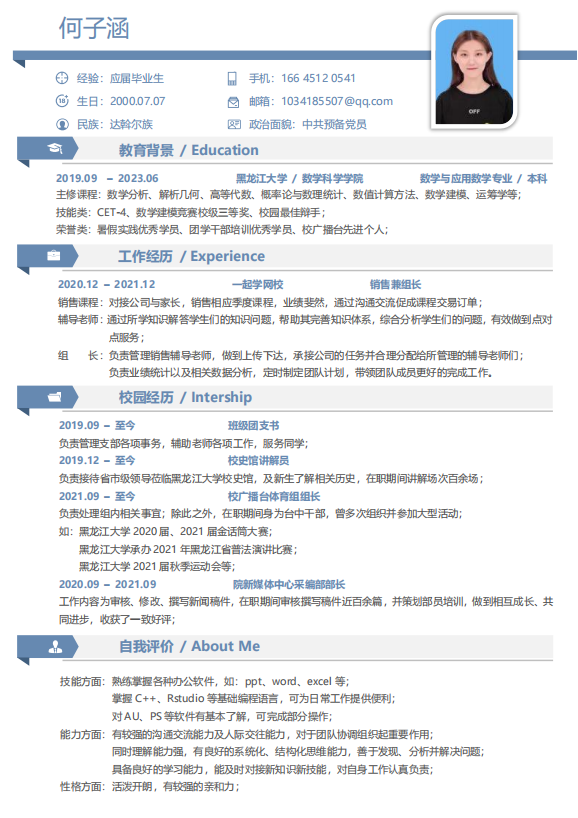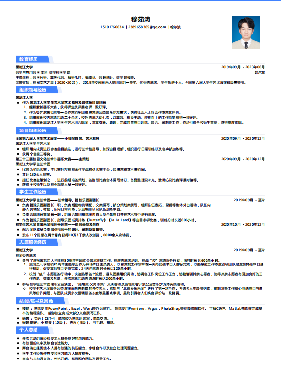 2022年12月,为加强同学们求职简历制作的能力,数学科学公司学院组织举办了破“简”而出,“职”通未来简历大赛。本次大赛共有两项内容,分别为: