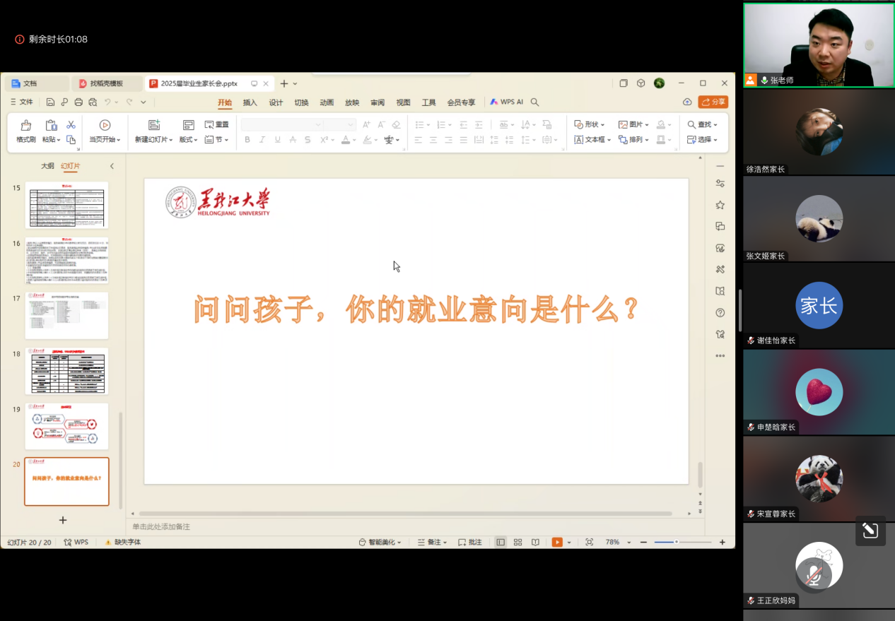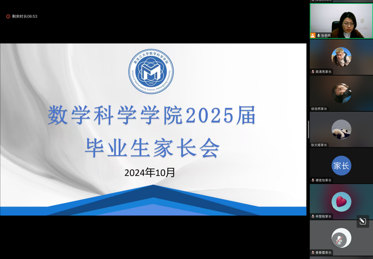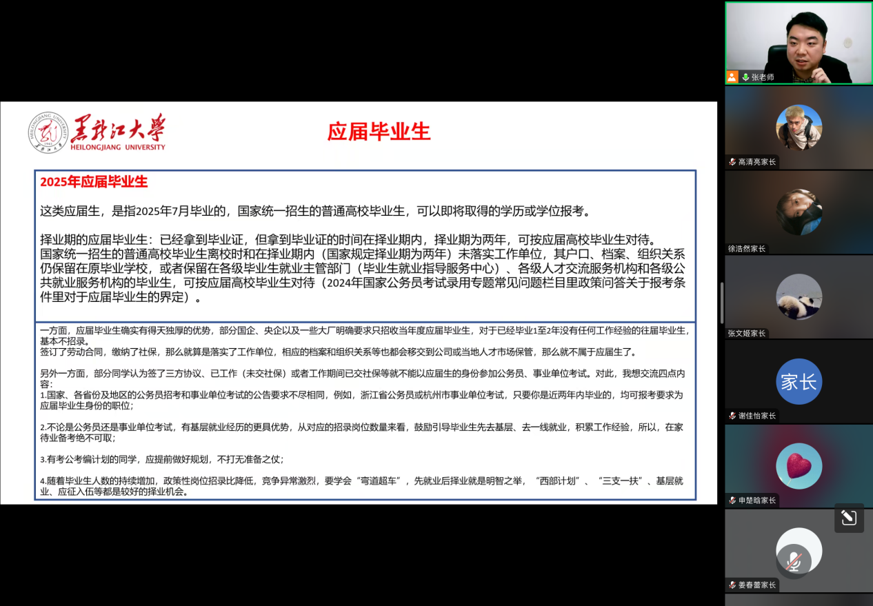张卓豪向员工家长汇报了学院2025届各专业员工毕业去向目前落实情况及未落实去向员工的就业意向,并从研究生考试的流程、关键时间节点、复试相关准备三个方面为考研员工梳理近期重点工作。会上,他分享了国考及各省公务员考试录用公告、事业单位公开招聘考试公告、各地市人才引进计划、学校双选会安排等招录信息,介绍了黑龙江省选调生报考相关事宜,重点推介银行、教师编制报考相关咨讯,并提醒各位家长帮助员工做好多手准备,树立先就业再择业的观念。结合毕业学分修读、毕业论文撰写、毕业去向落实三项工作叮嘱家长关注毕业年级工作动态,家校齐心,合力育人,共助员工顺利毕业。