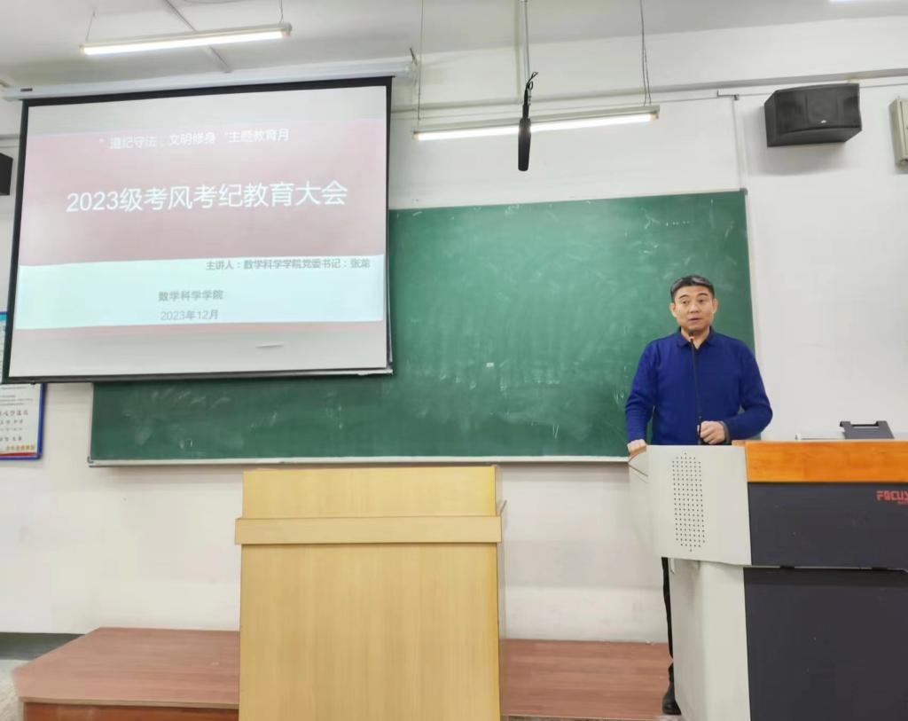 公司党委书记张龙于12月13日在三号楼为2023级新生讲考风考纪。张龙书记着重强调考风考纪的重要性,指出学校、学院将坚定不移持续加大力度严肃考试纪律。他结合自己的人生经历勉励大家要以饱满的热情、乐观的心态进行学习,告诫同学们要严守考试纪律,诚信应考,并告诫员工应自觉树立遵章守纪、诚实考试的意识,严格遵守考场纪律,自觉维护考场秩序。最后,他站在一线教学的角度,对解析几何、数学分析以及高等代数逐一讲解如何复习,如何提升学习效率等。他表示,要以诚信来展现实力,用实力去提升自信,端正态度、讲究方法、注重实效、持之以恒是为学习之道。